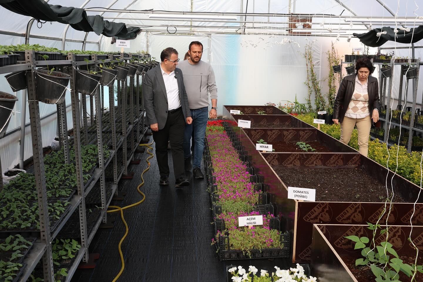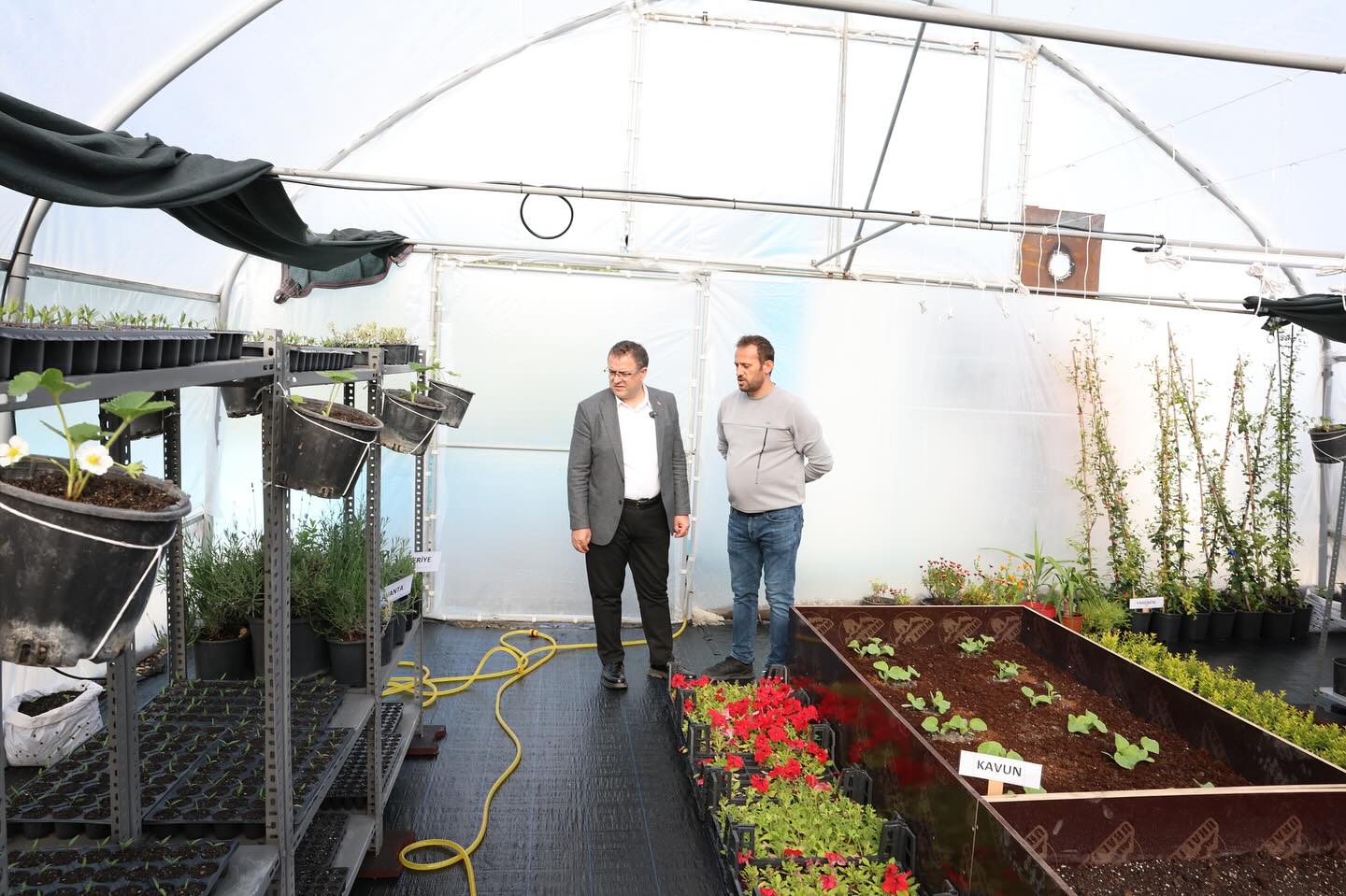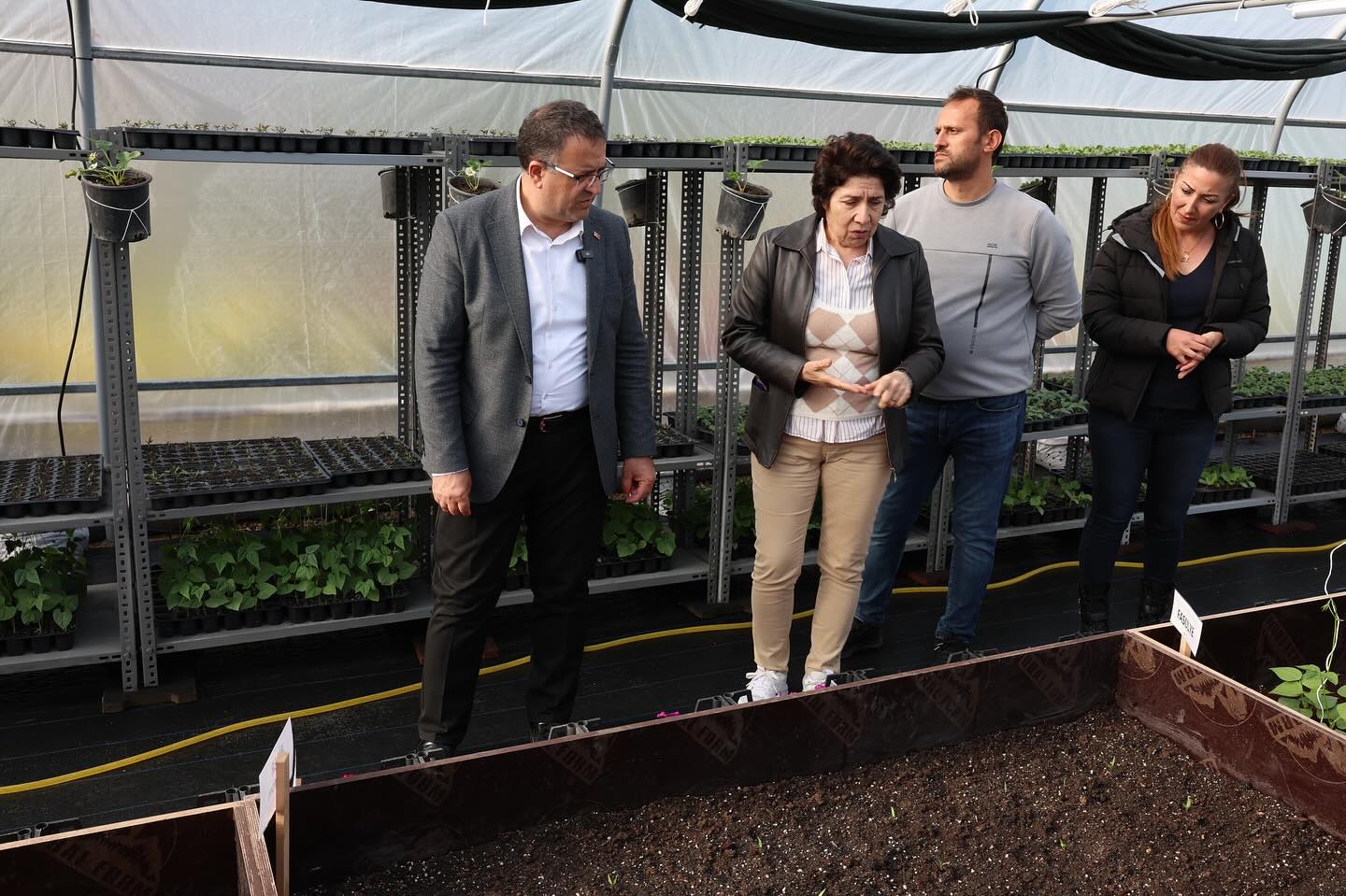 BAŞKAN 1-2-3-4: Sera bitki üretim merkezini ziyaret ederek devam eden çalışmalarla ilgili bilgi alan Derince Belediye Başkanı Av. Sertif Gökçe, “Doğaya ve üretime olan inancımızla, Derince Belediyesi olarak kendi seramızı kurduk” dedi.