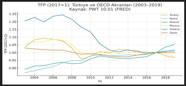 Aşağıdaki grafikte OECD içinde bazı ülkeler ve Türkiye’de verimlilik endeksinde, sarı renk Türkiye’dir. Bizden daha kötüsü Yunanistan’dır.