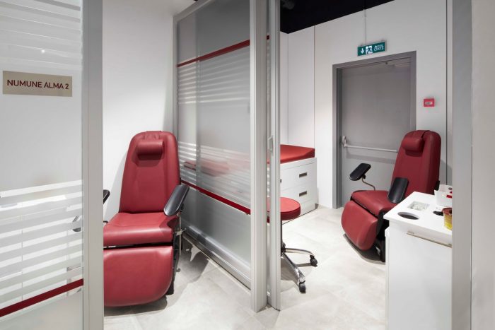 Doktor odası, mekanın ortasında şeffaf bir hacim olarak konumlandırılmış. Bu sayede hem doktorun mekanın merkezinde olarak tüm birimlere hakim olması, hem de arkada kalan hacimlere doğal ışık aktarılması sağlanmış. Karşısındaki ikram bankosu, karşılama ve kayıt bankosunun uzantısı olarak, sonundaki numune bankosu ile birlikte bir ünite olarak tasarlanmış ve uygulanmış. Giriş katın doktor odasından sonraki arka bölümü, kan alma odalarına ve tuvaletlere ayrılmış. Bu mekanlar özel olarak numune hacimleri olarak tasarlanmış ve numunelerin hemşireler tarafından alınabileceği özel bölmeler oluşturulmuş.