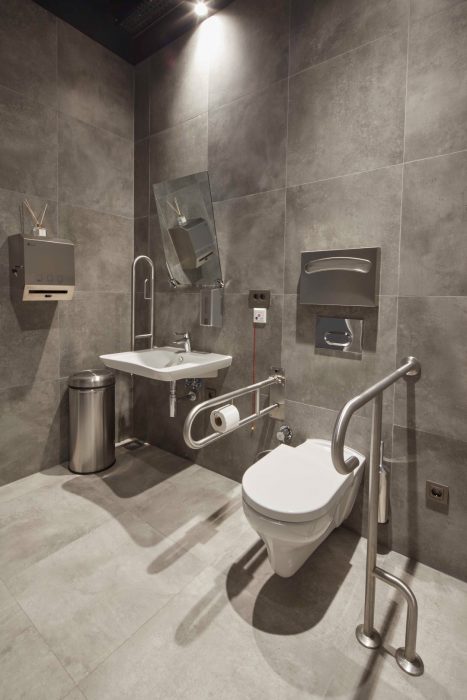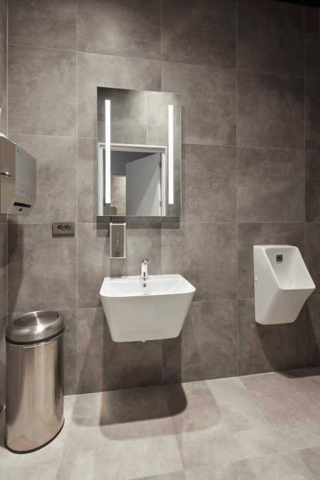 Bütün projede 4000K günışığı LED aydınlatma tercih edilmiş ve tüm mekanın duvarlarında zeminden tavana depolama mobilyaları uygulanmış. Yüzey kaplaması olarak mekandaki hijyen duygusunu ve ışık miktarını artırmak adına Hi-Gloss beyaz laminat tercih edilmiş ve tüm zemin ve ıslak hacimlerde brüt beton desenli 60×60 cm ölçülerde porselen seramik uygulanmış. Projede antrasit renkli dekoratif havalandırma kanalları ve mekanik aksam, ayrıca duvarların 280 cm’den üstünün ve tavanın aynı renkte boyanması ile endüstriyel bir görüntü elde edilmiş.