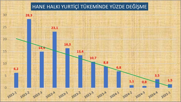 Enflasyonun gerilemesine hane halkı talebinde düşme neden oldu. Aşağıdaki grafikte çeyrekler itibariyle hane halkı tüketiminde artış hızı son yılda yüzde birler seviyesine düştü.