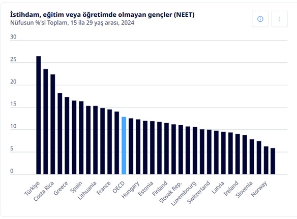 Öte yandan OECD ülkeleri içinde ne eğitimde ne işte olan gençler arasında en yüksek oran Türkiye’dedir. Aşağıda OECD Grafiğinde görüldüğü gibi ne eğitimde ne işte olanların oranı OECD ortalaması yüzde 13,5 iken Türkiye de en yüksek yüzde 27’dir.