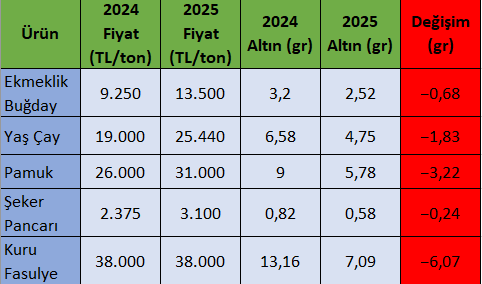 | Ürün | 2024 Fiyat (TL/ton) | 2025 Fiyat (TL/ton) | 2024 Altın (gr) | 2025 Altın (gr) | Değişim (gr) |
