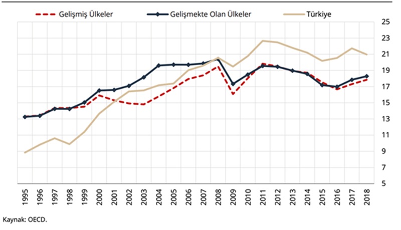 Aşağıdaki grafik 1995 -2018 arasındaki yıllarda, Gelişmiş ve gelişmekte olan ülkeler ile Türkiye’nin üretimde ithal girdi oranını gösteriyor. 2007 sonrası Türkiye de üretimde ithal girdi oranının gelişmiş ve gelişmekte olan ülkeler ortalamasından daha fazla olduğu görülüyor.