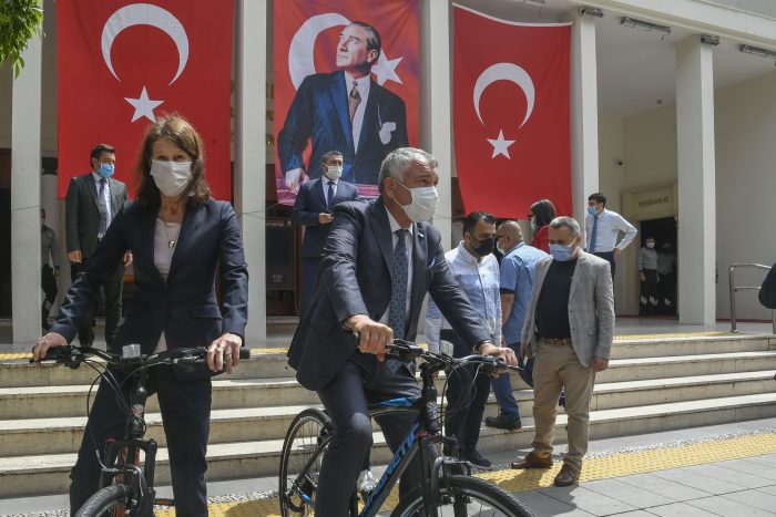 Başkan Zeydan Karalar ve Büyükelçi Kwaasteniet daha sonra Adana Büyükşehir Belediyesi’nin tarihi binası önünde bisiklet sürerek, bisiklet kullanımıyla ilgili farkındalık yaratma çabalarına uygulamalı destek verdi.
