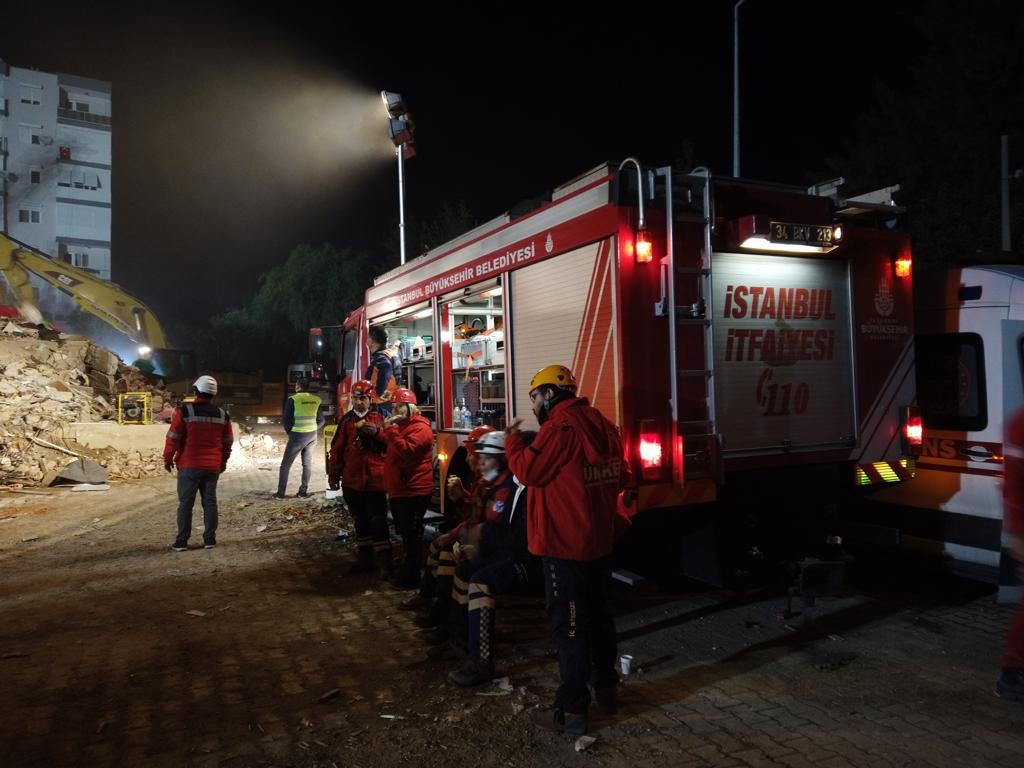Başkan İmamoğlu’nun talimatıyla, İzmir’e hareket eden İstanbul Büyükşehir Belediyesi’ne (İBB) bağlı birimler, bütün saha ekipleri gibi canlı bedenlere ulaşmak için en kritik süre olan 72 saatin tamamlanmasından önce, var gücüyle çalışmalarını aralıksız sürdürüyor. Kurtarma çalışmalarının üçüncü gününde, toplam beş vatandaş enkaz altından yaralı olarak çıkartılırken, dokuz vatandaşın cansız bedenine ulaşıldı. İBB İtfaiyesi ve İSKİ arama kurtarma ekiplerinin yanı sıra İBB Lojistik Destek ekipleri, Park Bahçeler ve İSBAK bölge halkına desteklerini sürdürüyor.