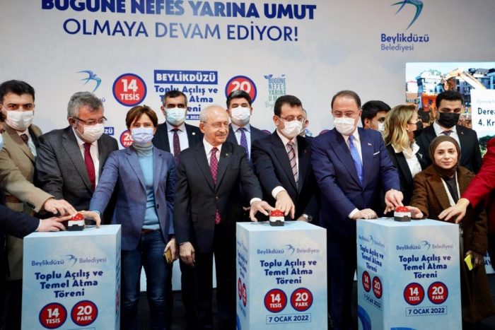 CHP Genel Başkanı Kemal Kılıçdaroğlu, İYİ Parti Genel Başkanı Meral Akşener ve İBB Başkanı Ekrem İmamoğlu, Beylikdüzü Belediyesi’nin düzenlediği kreşten lojistik merkezine, polis merkezinden Kuran kursuna kadar 14 tesisten oluşan temel atma ve açılış törenine katıldı.
