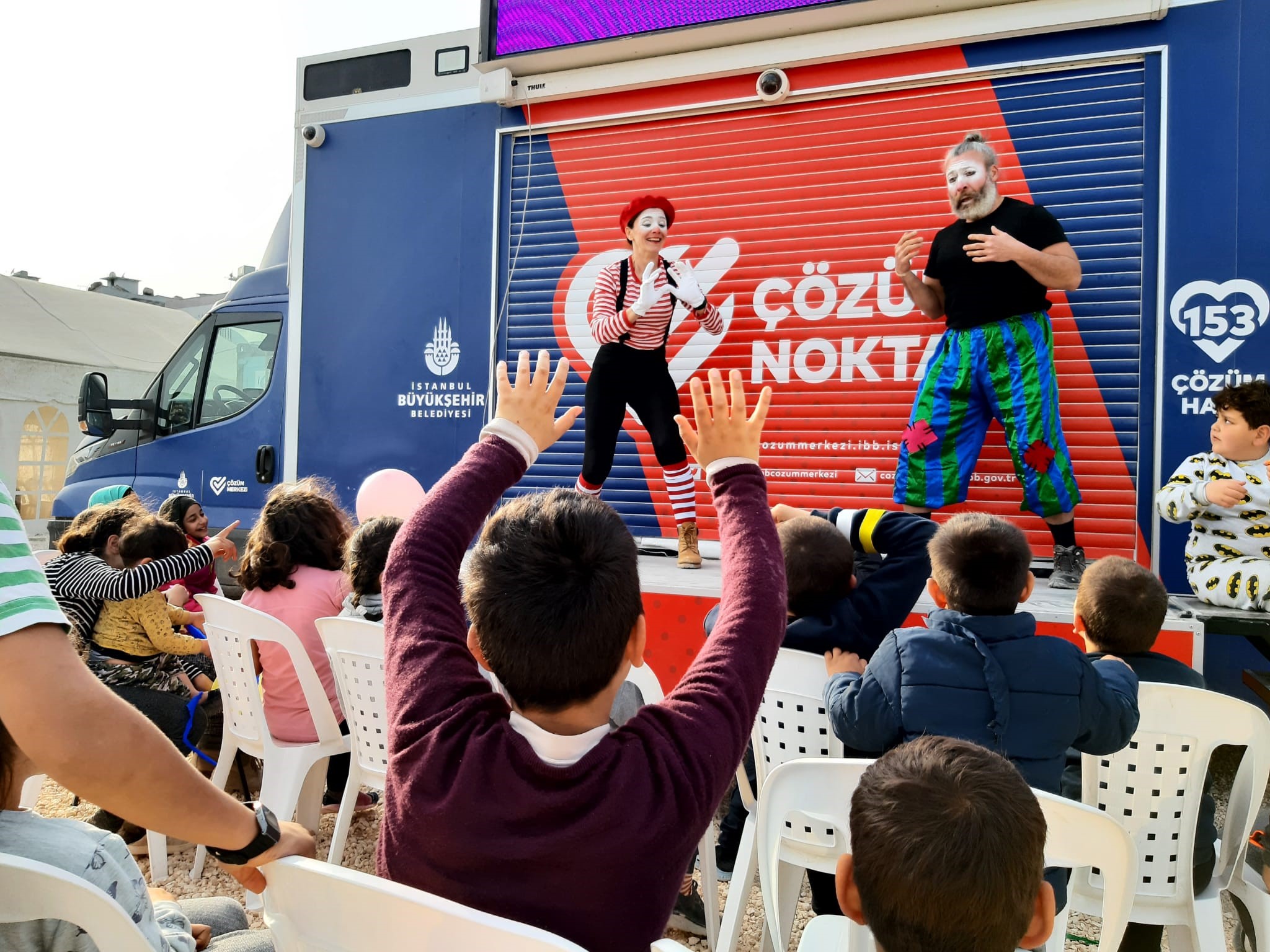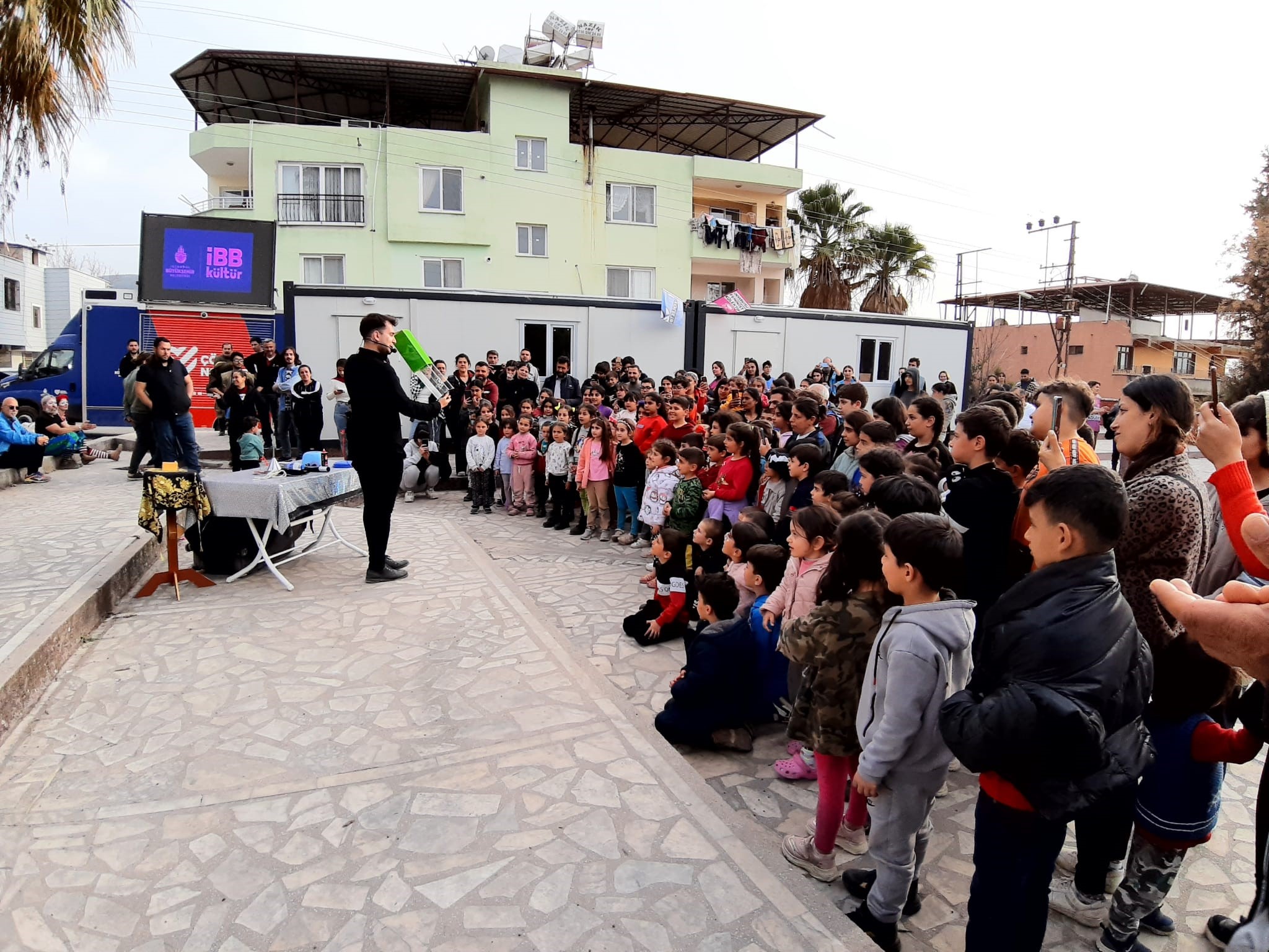 İBB Antakya Afet Koordinasyon Merkezi’nde, Milli Eğitim Bakanlığı’na bağlı eğitim çadırında çocuklara yönelik atölyeler kurdu. Hatay’da merkezden başlayarak Samandağ ve Defne ilçelerinin mahallelerini İBB Şehir Tiyatroları oyuncuları geziyor. İBB, yaratıcı dramalar, çocuk tiyatrosu ve illüzyon gösterileri ile yüzlerce depremzede çocuğun yüzlerini güldürüyor.