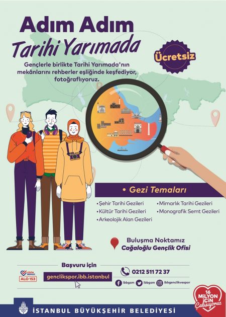 İBB Gençlik ve Spor Şube Müdürlüğü’nün üstlendiği proje ile gençler, sanat tarihi uzmanları ve rehberler eşliğinde turlara katılarak Tarihi Yarımada’yı gezecek. Uzmanlar, rota üzerindeki noktaları ayrıntılı olarak gençlere anlatacak. 15-29 yaş arası gençler katılabileceği gezilere genclikspor.ibb.istanbul  adresinden kayıt yapılabilecek.
