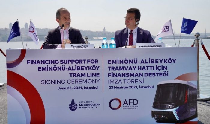 Ekrem İmamoğlu yönetimindeki İstanbul Büyükşehir Belediyesi (İBB), önceki idarenin 2016 yılında başlatıp, süresinde bitiremediği Eminönü-Alibeyköy Tramvay Hattı’nda, finansman sorunlarını çözerek yapım sürecini hızlandırılmıştı. Hattın ilk etabı olan Cibali-Alibeyköy bölümünün açılışı, 1 Ocak 2021’de, CHP Genel Başkanı Kemal Kılıçdaroğlu ve İYİ Parti Genel Başkanı Meral Akşener’in katılımıyla gerçekleştirilmişti. Hattın Eminönü’ne kadar uzatılması için imalatlarını sürdüren İBB ve Fransız Kalkınma Bankası (AFD) arasında, söz konusu projeye 93 milyon Euro tutarında finansman desteği sağlanması amacıyla, ön protokol imzalandı. Hattın Balat’taki merkez şantiyesinde, muhteşem İstanbul manzarası eşliğinde düzenlenen imza töreni; İBB Başkanı Ekrem İmamoğlu, Fransa İstanbul Başkonsolosu Olivier Gauvin ve AFD Operasyonlardan Sorumlu İcra Direktörü Jean Pierre Marcelli katılımıyla gerçekleştirildi. İBB üst yönetimi de törende tam kadro hazır bulundu.