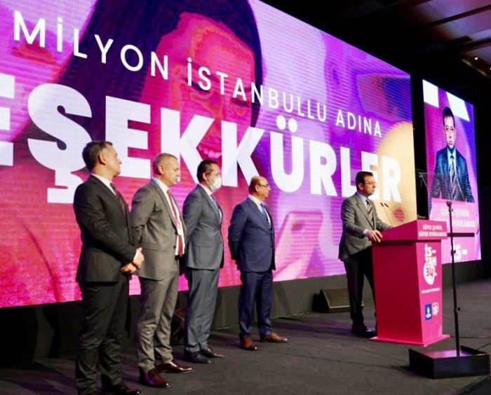 İmamoğlu, konuşmasının sonunda, 2 yılı bulan hazırlık sürecinde İBB’nin tescilli ‘İstanbul Senin’ projesini hayata geçiren ekip liderleri Bilgi İşlem Daire Başkanı Erol Özgüner, UGETAM Genel Müdürü İbrahim Edin ve proje direktörü Hakan Kaplan ile uygulamasının yazılımında iş birliği yapılan Almanya merkezli KOBİL şirketinin kurucusu İsmet Koyun’u sahneye davet etti. Projede emeği geçen herkese teşekkürlerini ileten İmamoğlu; Özgüner, Edin, Kaplan ve Koyun’a plaketlerini sundu. Ege Tv. Marmara Bölge/ Şişli / İstanbul