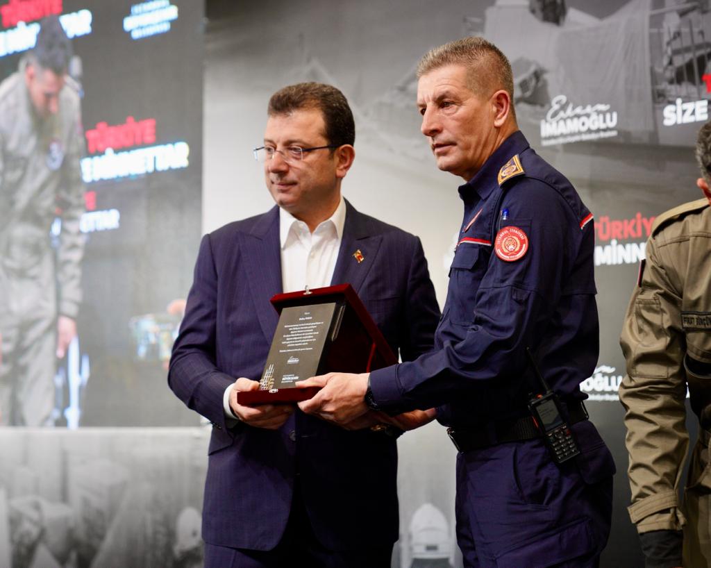 İmamoğlu’nun konuşmasının ardından, deprem bölgesinde görev yapan binlerce İBB personeli adına, farklı birimlerden toplam 18 çalışana sembolik plaketleri takdim edildi. Arama-Kurtarma ekip lideri, Avrupa Yakası İtfaiye Şube Müdürü Erdinç Turan, K9 Arama-Kurtarma ekibinden Fırat Bürçün (K9 köpeği Joker ile birlikte), Hızır Acil Danışmanı Prof. Dr. Doğaç Niyazi Özüçelik, İSKİ Risk Yönetim Şefliği’nden İbrahim Yazkan, İGDAŞ İş Sağlığı Güvenlik Şefi, Arama-Kurtarma Ekip Şefi Hüseyin Yıldırım, Zabıta Memuru Oktay Öksüz, Veteriner Teknikeri Buğra Burakhan Acar, Halkla İlişkiler görevlisi Mahmut Fatih Uzunyaşa, Sağlık ve Hıfzıssıhha Müdür Yardımcısı Oğuz Başaran, Elektronik Sistemler Müdürlüğü, Wi-Fi Ekip Şefi Kasım Filiz, Medya A.Ş. Genel Müdür Yardımcısı Sibel Karakurt, muhabir Betül Uzundere, BOĞAZİÇİ A.Ş. Destek Hizmetleri Personeli Süleyman Yıldırım, İSTGÜVEN Özel Güvenlik Görevlisi Cüneyt Gürsu, KİPTAŞ Kontrol Amiri Kamuran Ekmen, Metro A.Ş. Uzman Bakım Mühendisi Aslen Edinç, Şehir Hatları Kaynak Ustası Oktay Sezer ve Spor İstanbul Mobil Teknik Hizmetler Sorumlusu İbrahim Alveroğlu, plaketlerini İmamoğlu’nun elinden aldı.  FATİH / İSTANBUL