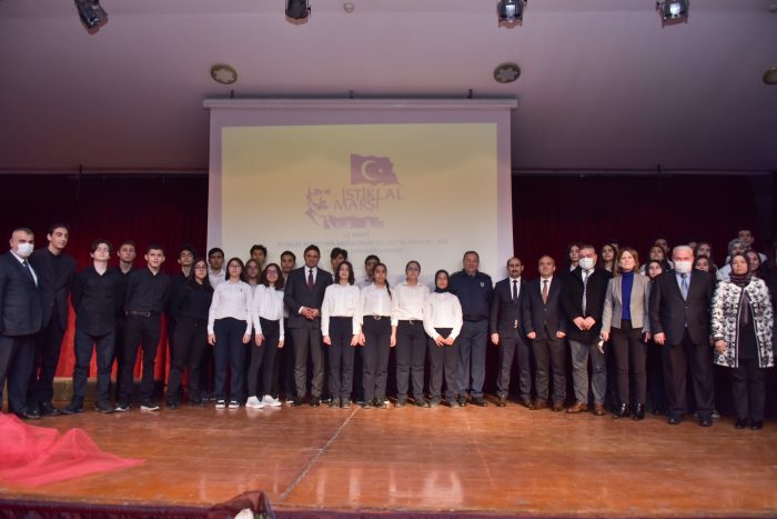 Saygı duruşunda bulunulması ve İstiklal Marşı’nın okunmasıyla birlikte başlayan program Aliağa İlçe Milli Eğitim Müdür Dr. Erdoğan Akyüz’ün konuşmasıyla devam etti. Akyüz, “İstiklal Marşımız vatan, millet, bayrak ve İstiklal aşkının ilmek ilmek dokunduğu eşsiz bir eserdir. 724 şiir arasından seçilen marşımız 12 Mart 1921’de birinci mecliste coşku, gurur ve heyecana sevk etmekle kalmamış aynı zamanda o günden bugüne bağımsızlığımızın sembolü olarak milletimizin benliğinde yerini almıştır. İstiklal Marşımız, istiklalimizin sembolü, istikbalimizin de teminatı olmuştur” dedi.