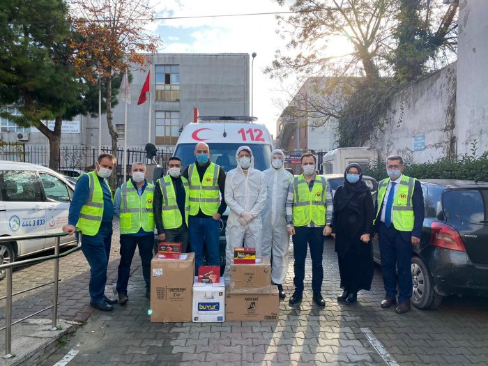 İyi Kalpler Yardımlaşma ve Kültür Derneği Başkanı Adem Dişçi, dernek olarak tedarik ettikleri ürünleri Bayrampaşa İlçe Sağlık Müdürü Dr. Aydın Korkmaz ve Filyasyon ekibi sorumlusu Dr. Büşra Sandıklı’ya teslim etti.