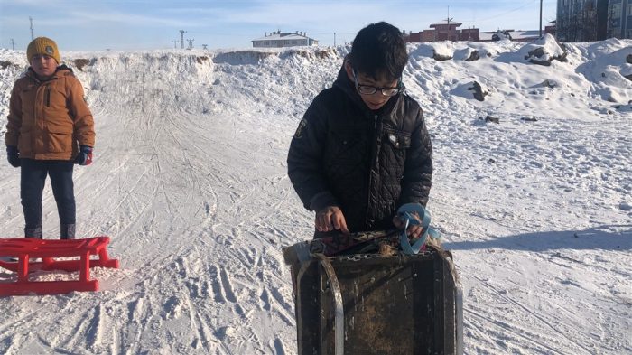 Kars’ta kar yağışını eğlenceye çeviren çocukların keyfine diyecek yok. Kızaklarını kaptıkları gibi soluğu evlerinin önlerinde veya mahallelerindeki uygun yerlere alıyorlar.