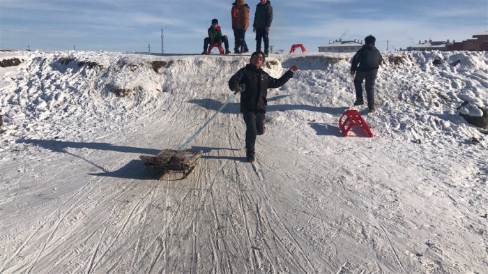 Kars’ta kar yağışını eğlenceye çeviren çocukların keyfine diyecek yok. Kızaklarını kaptıkları gibi soluğu evlerinin önlerinde veya mahallelerindeki uygun yerlere alıyorlar.