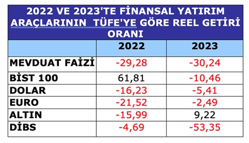 2023 yılında, altın hariç finansal yatırım araçlarının tamamı reel kayıp getirdi. 2022 yılında da yalnızca borsa reel getiri sağlamış, diğer araçların tamamı reel kayıp getirmişti.