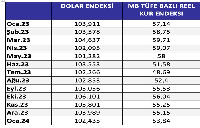 3- Dolar ve Euro son iki senedir reel kayıp getirdi. 2023 yılında dolara karşı TL değer kazandı. MB TÜFE bazlı reel kur 2023 ocak ayında 57,14 idi. Yıl sonunda 53,84’e geriledi. Yani TL yüzde 7,7 oranında değer kazandı.
