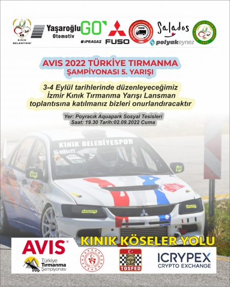 AVIS Türkiye Tırmanma Şampiyonası 5. ayağı, İzmir Motorsporları ve Otomobil Kulübü (İMOK) tarafından ICRYPEX ana sponsorluğunda Kınık Belediyesi katkılarıyla İzmir’in Kınık ilçesinde gerçekleştirilecek.