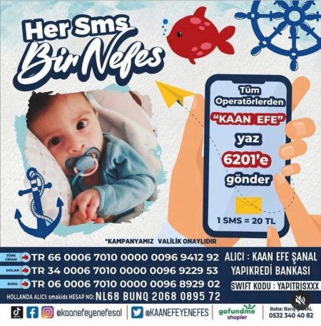 “ Tüm operatörlerden “KAAN EFE” yazıp 6201’e göndererek, İnstagram üzerinden @kaanefeyenefesol sayfasını takip ederek ve bağış için düzenlenen canlı yayınlara da katılarak yavrumuza destek olabilirsiniz. Valilik izniyle başlatılan bu kampanyada Kaan Efe için birlikte el ele vererek başaracağız. Sen varsan, umut var.” dedi.