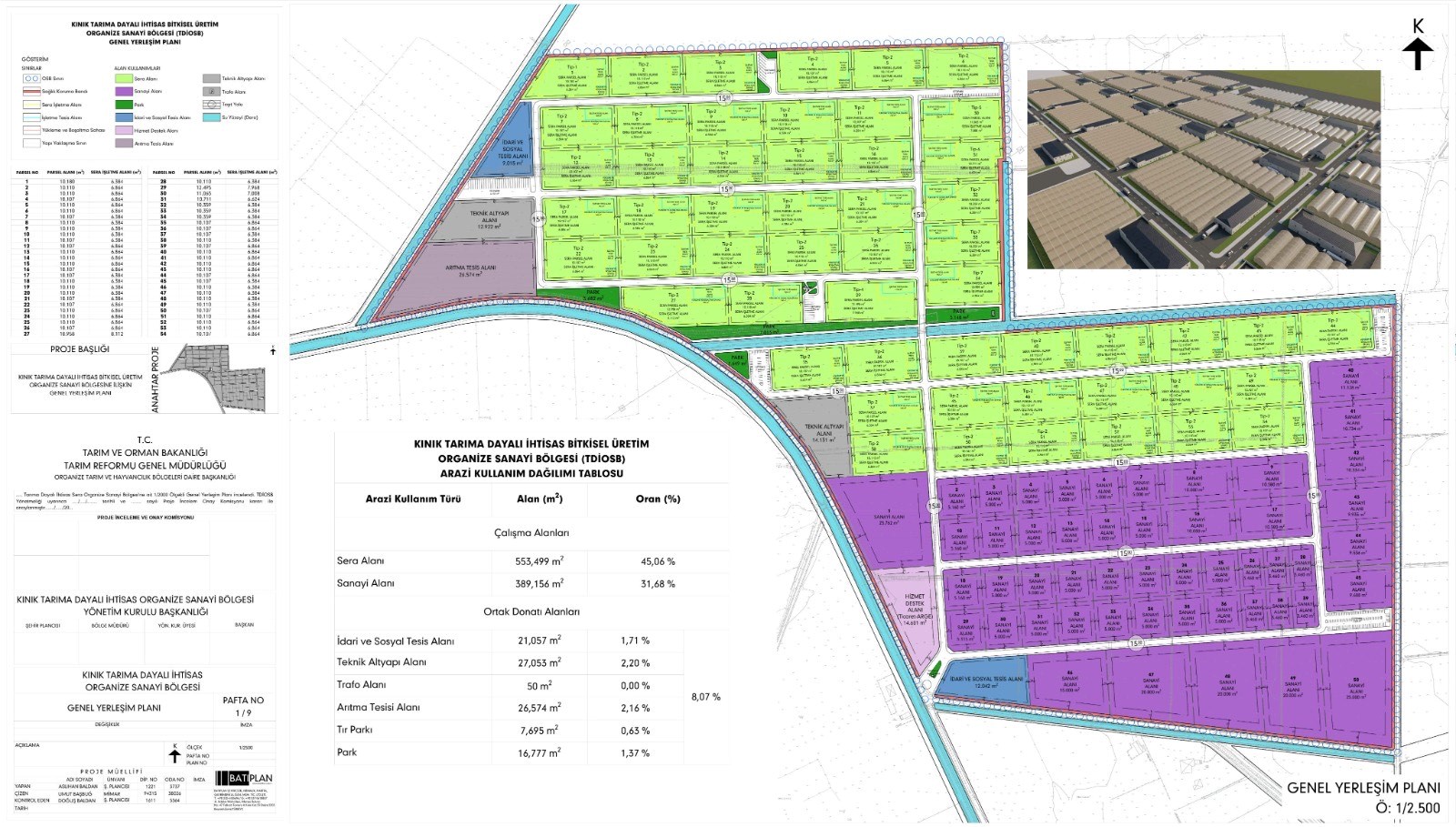 Dünyada ilk olma özelliğine sahip İzmir Kınık Tarıma Dayalı İhtisas Bitkisel Üretim (Tohum, Fide, Tıbbi ve Aromatik Bitkiler) Organize Sanayi Bölgesi’nin (TDİOSB), Genel Yerleşim Planı ve Üst Yapı Modül Projeleri 12 Haziran 2023 tarihinde onaylandı.