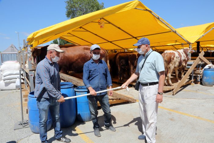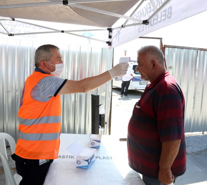 Pazarın uygun yerlerine asılan bilgilendirme afişlerinde, sosyal mesafenin korunması, maske kullanımı, el hijyenine özen gösterilmesi ve tokalaşma yapılmaması uyarıları dikkat çekti. Alana girişlerde ateş ölçer kontrol noktaları oluşturulurken, 30’dan fazla noktaya da el dezenfektanları yerleştirildi.