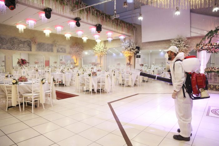 Küçükçekmece Belediyesi normalleşme sürecinde kontrollü olarak hizmet veren düğün, nikah ve toplantı salonlarında koronavirüs (Covid-19) tedbirleri kapsamında dezenfekte çalışmalarına devam ediyor. Tüm dünyayı etkisi altına alan yeni tip Koronavirüsle mücadelesine aralıksız devam eden Veteriner İşleri Müdürlüğü ekipleri tedbiri elden bırakmayarak düğün, nikah ve toplantı salonlarını dip köşe dezenfekte ederek steril hale getirdi. Ayrıca belediye ekipleri masa ve sandalye aralarındaki mesafeyi ve salonlarda asılı olması gereken uyarı afişlerini de kontrol etti. Koronavirüsle mücadele kapsamında İlçede halkın yoğun olarak kullandığı kamusal alanlar periyodik olarak kesintisiz dezenfekte ediliyor.