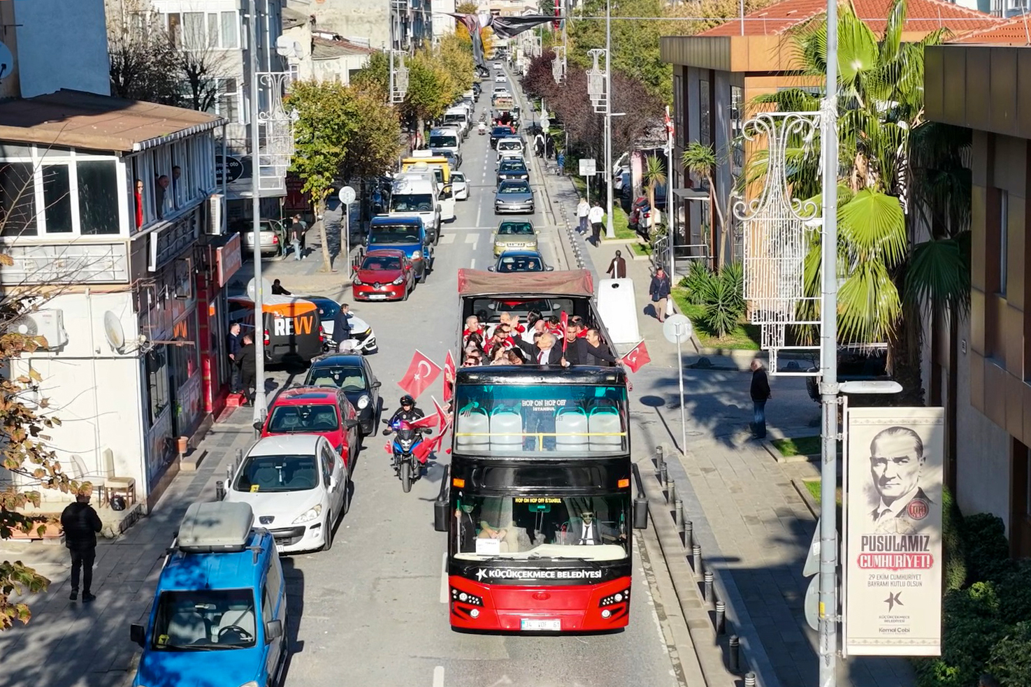 “Tarihimizin en şanlı, en anlamlı günlerinden birini, büyük bir gurur ve tarifsiz bir coşkuyla kutluyoruz. Cumhuriyet Bayramımız kutlu olsun. Cumhuriyet sadece bir yönetim biçimi değil, aynı zamanda insan onurunun, eşitliğin ve özgürlüğün güvencesidir. Bizden sadece yeni yaşını kutlamamızı değil, ona sımsıkı sarılıp sahip çıkmamızı istiyor. Daha çok çalışmamızı, daha çok üretmemizi, daha çok kenetlenmemizi bekliyor. Her birimizin bu büyük emanete karşı bir sözü, bir sorumluluğu var! Bu miras, sahada doktor olan Ali’ye, öğretmen Ayşe’ye, emeğiyle bu kenti ayakta tutan temizlik işçisi Hasan’a, belediye başkanı Kemal’e emanettir.