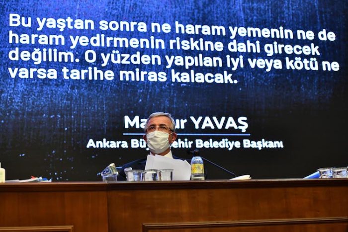 “Bütçe konuşmasında ve faaliyet raporunda saatlerce konuştunuz. Bu soruların içerisinde Mansur Yavaş’ın belediyemizin ihaleleri ile ilgili kendisine menfaat temini ettiğine dair bir iddiası olan var mı? Bunu onların yüzlerine sormak isterdim. Peki Mansur Yavaş’ın yakınlarına menfaat temin ettiğine dair bir iddiası olan var mı? Mansur Yavaş kendi zenginlerini yaratıyor diye bir iddianız var mı? Ya da böyle bir şey duydunuz mu? Mansur Yavaş, kendi ailesinden birilerini zengin ediyor diye bir şey duydunuz mu? Mansur Yavaş’ın belediyeye alıyorum tezgahıyla evine eşya aldığına dair bir bilgi geldi mi hiç? Mansur Yavaş’ın Cumhuriyet Halk Partisi ve İYİ Parti İl Başkanlıklarında özel hizmette çalışan personeli belediyede çalışıyor gibi gösterdiğine ilişkin bir şey duydunuz mu? Allah’ın izniyle bunların hiçbirisini duymadınız ve duyamayacaksınız. Çünkü hiçbir zaman yapılmayacak ve biz bize güvenenlerin başını öne düşürmeyeceğiz. Kimse kusura bakmasın ama şunu söylemek durumundayım bu iddialardan herhangi birini duyup da savcılığa gitmeyen o suça ortaktır ve namerttir.”