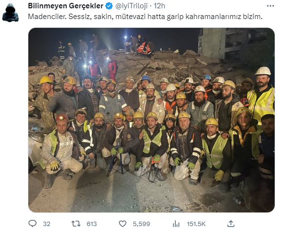 Depremin ilk gününden itibaren dört koldan yaraları sarmak için çırpınan Türk madencilik sektörü başkanları, kamu yöneticileri, deprem uzmanları, gazeteciler, sosyal medya kullanıcıları, canları pahasına kendilerini enkazın altına atan, on binlerce canı kurtaran koca yürekli madencilerle gurur duyan paylaşımlar yaptı.