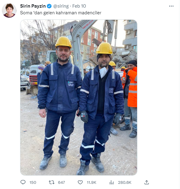 Gazeteci Şirin Payzın da tweetinde “Soma’dan gelen kahraman madenciler” notunu düştü.