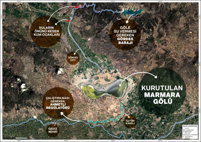 Ulusal Öneme Haiz Sulak Alan statüsünde olan Marmara Gölü, geçtiğimiz yaz aylarında tamamen kurumuştu. Kuraklığın yanı sıra göle akan su kaynakları kesilmişti. Şu an göl sadece yağmur sularıyla besleniyor. Gölün eski haline gelmesi için acilen Gördes Barajı ve Ahmetli Deresi’nden göle su verilmeli.