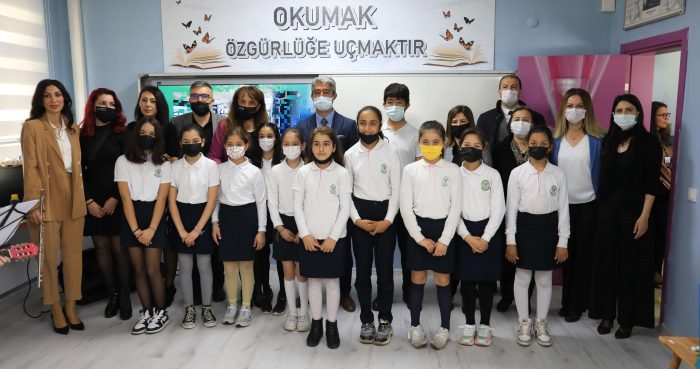 Kütüphaneye yeni kitaplık rafları, öğrencilerin çalışmalarını gerçekleştirebilecekleri şekilde masa ve sandalyeler yerleştirildi. Açılışta öğrenciler müzik dinletisi sundu. Çocukların kitaplara kolay erişebilmeleri ve okuma alışkanlığı kazanmaları için kütüphanelerin çok önemli olduğunu hatırlatan Başkan Oktay “Çocuklarımızın yüzündeki mutluluk bizim için çok önemli, imkanlarımız ölçüsünde onlara dokunan çalışmalar yapmaya devam edeceğiz” ifadelerini kullandı.