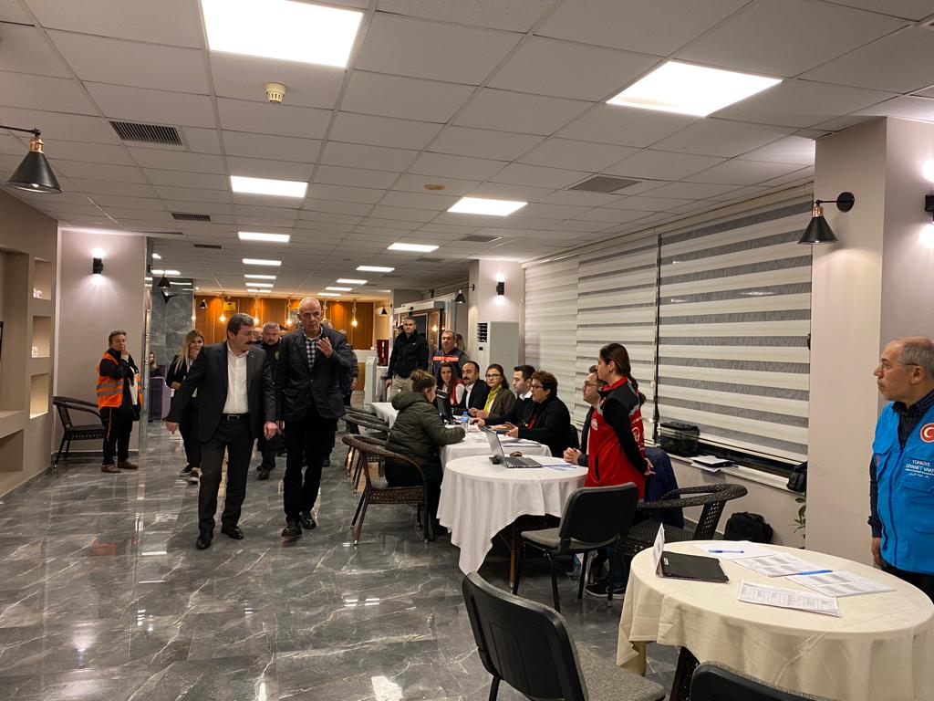 Uygulama Otelinde ilk olarak depremzede kayıt masasını ziyaret eden Vali Orhan Tavlı, barınma yerlerine yerleştirilen depremzedeler ile görüştü, ayrıca otelde kurulan revir ve sosyal market gibi alanlarda incelemelerde bulundu.