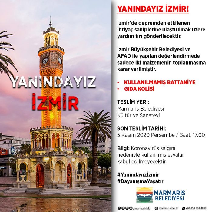 Marmaris Belediyesi, İzmir depreminde etkilenen vatandaşlara yardım etmek için kampanya başlattı. Şimdilik kullanılmamış battaniye ve gıda kolisinin toplanacağı yardımlar Cuma günü İzmir’e götürülecek.