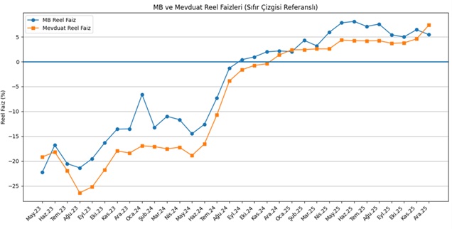 MB başkanı ve Hazine ve Maliye Bakanı göreve geldikten sonra, Mayıs 2023 ‘ten Eylül 2024 ‘e kadar, MB gösterge faizine göre reel faiz oranı ekside kaldı. Bir sene 5 ay sonra, Eylül 2024’te reel faiz oluştu.