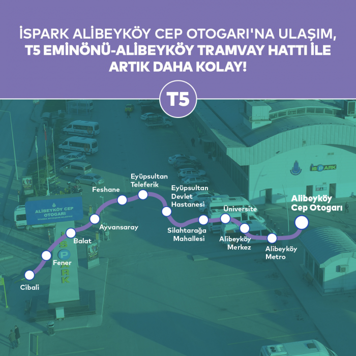 İstanbul Büyükşehir Belediyesi’nin (İBB) açtığı T5 Eminönü -Alibeyköy Tramvayının Cibali- Alibeyköy Cep Otogarı arasındaki hattı ile İSPARK Alibeyköy cep otogarına yeni bir ulaşım ağı hizmete girdi. Her gün binlerce vatandaşın farklı illere seyahat etmek amacıyla uğrak yeri olan Alibeyköy cep otogarına ulaşım daha da kolaylaşıyor. İBB’nin 2021’in ilk gününde Başkan Ekrem İmamoğlu’nun katılımıyla açılışını yaptığı Eminönü Cibali-Alibeyköy Tramvay hattı ile vatandaşlar otogara güvenli ve hızlı bir şekilde ulaşabilecekler. Otogara farklı şehirlerden gelen yolcularda tramvay hattını kullanarak Eminönü’ne oradan aktarma yaparak istedikleri güzergâha toplu taşıma araçlarıyla kısa zamanda ulaşabilecekler.