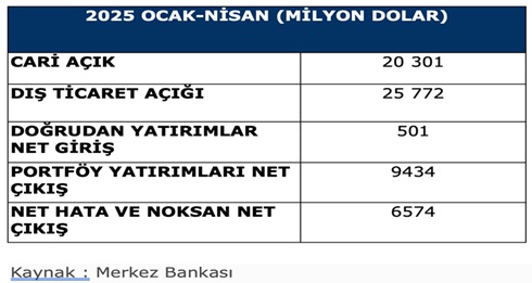 Öte yandan Ocak-Nisan 4 aylık cari açık , geçen sene 15,6 milyar dolar iken bu sene 20,3milyar dolara yükseldi. Net hata ve noksan kaleminden kaynağı belirsiz olan 6 milyar 574 milyon dolar çıktı.
