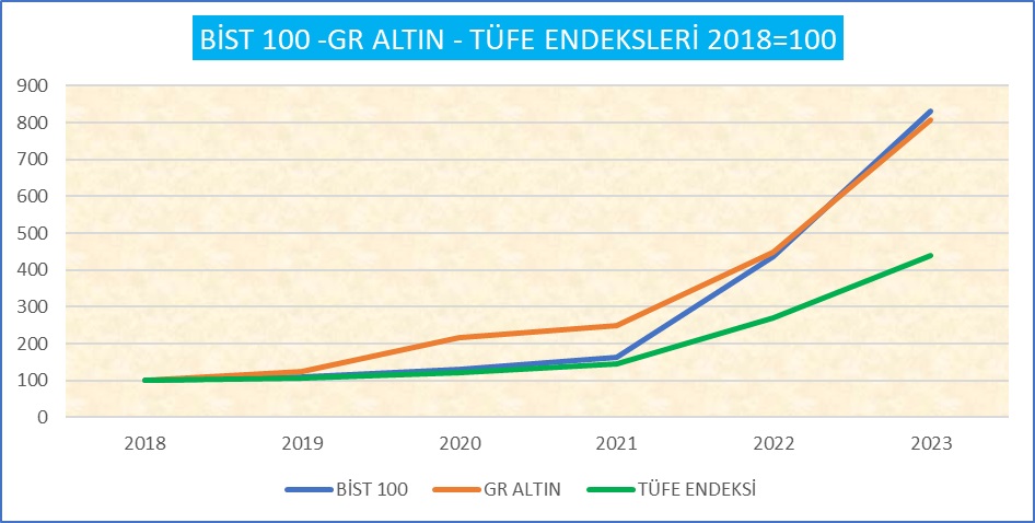 Aşağıdaki grafikte son beş yılda, 2018 = 100 bazlı, TÜFE, Altın ve borsa endeksleri görülüyor. Altın da, Borsa da TÜFE’nin üstünde artmış.