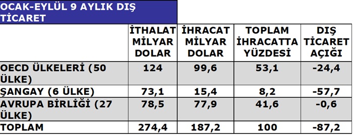 İhracatımızın çok azını, yüzde 8,2’sini yaptığımız Şanghay işbirliği örgütü ülkelerine ise , 9 aylık dış ticaret açığımızın üçte ikisini , yüzde 66’sını verdik. (aşağıdaki tablo)