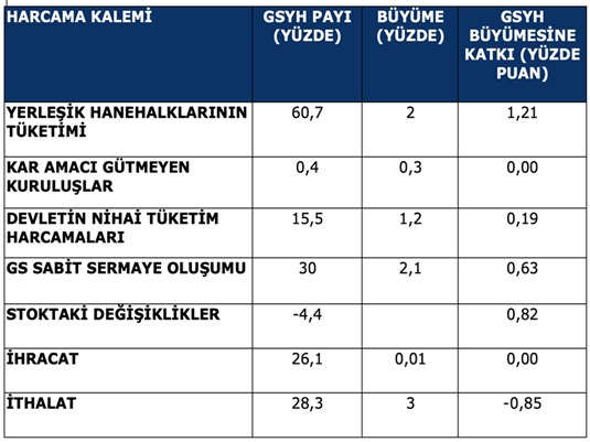 İç talep önceki çeyreklere göre düştü ve fakat yine de birinci çeyrek büyümeye en yüksek katkı talep artışından geldi. Dış ticaretin büyümeye katkısı eksi oldu. (Aşağıdaki tablo)