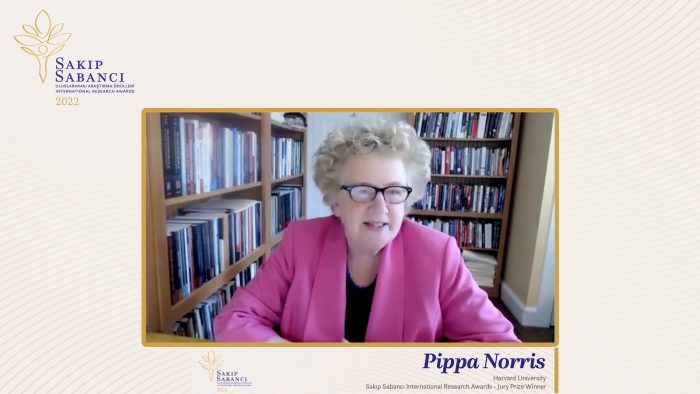 2022 Sakıp Sabancı Uluslararası Araştırma Ödülleri’nde Jüri Özel Ödülü’ne layık görülen Profesör Pippa Norris, çevrim içi ödül töreninde yaptığı konuşmada, “Sosyal bilimlerde mükemmelliği teşvik ve takdir eden dünyanın önde gelen ödüllerinden biri olan Sakıp Sabancı Uluslararası Araştırma Ödülleri’ne katılmaktan onur ve mutluluk duyuyorum” dedi.