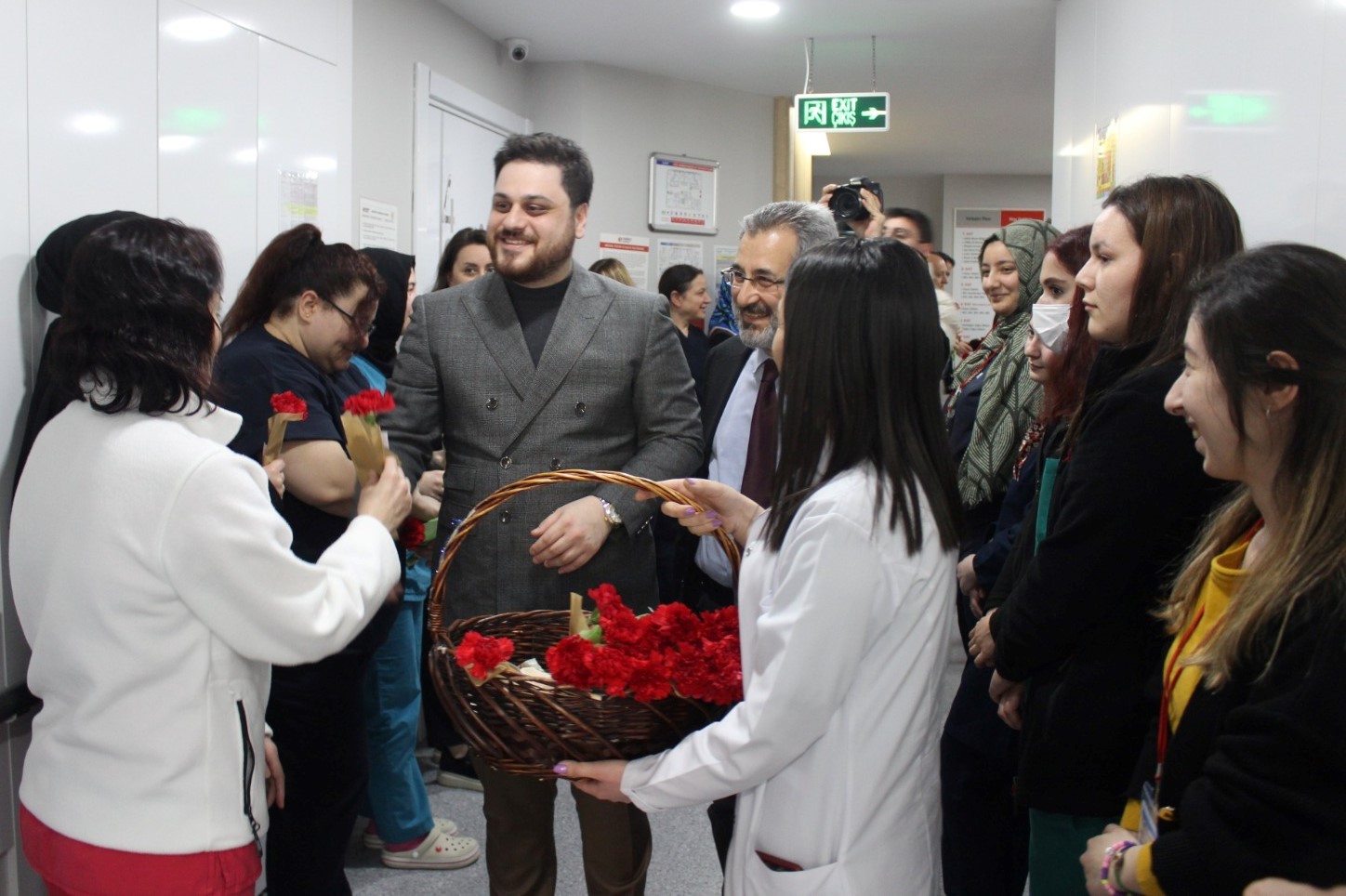 BTP Genel Başkanı Hüseyin Baş konuşmasının ardından sağlık çalışanlarına gül dağıttı.
