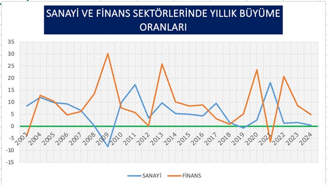 2003 ile 2024 yılları arasında geçen 22 yılda sanayi sektöründe ortalama yıllık büyüme oranı yüzde 5,75 olurken, finans sektöründe yüzde 9,13 oldu. (Aşağıdaki grafikte her iki sektörde 22 yıllık büyüme oranları yer alıyor.)