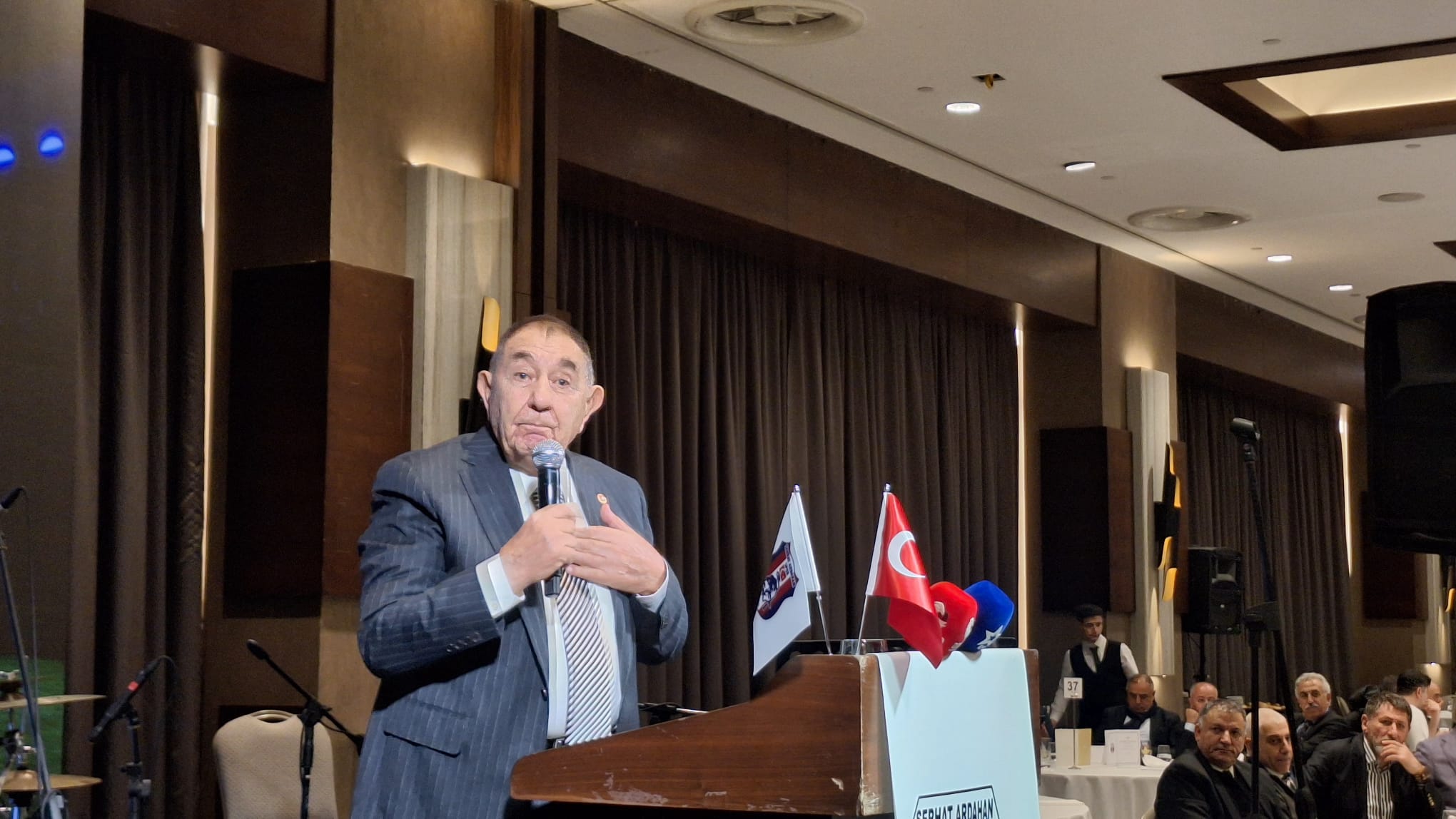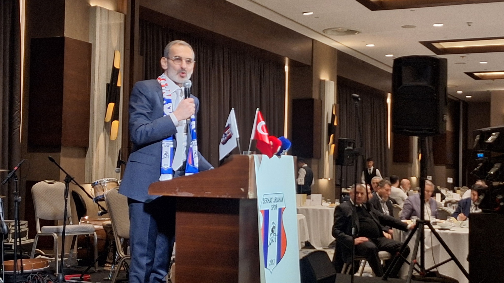 Serhat Ardahanspor Kulübü Başkanı Üzeyir Engin yaptığı konuşmada” Sorumluluğumuzu biliyoruz, işimizin farkındayız ve ne yapacağımızı biliyoruz. Serhat Ardahanspor’u Şampiyon yapmak için çok güçlü bir kadro kurduk. Şimdiye kadar 24 milyon harcadık topladığımız bağış 1 milyon. Bu geceye katkılarından dolayı Çekmeköy Belediye Başkanı Orhan Çerkez’e teşekkür ediyorum. Ayrıca bize her zaman destek olan yanımızda olan Ardahan Belediye Başkanı Faruk Demir’e teşekkür ediyorum. Tüm Ardahanlılara söz veriyorum bu takımı 3. lige çıkaracağım. 4 transfer yapmamız lazım. Bu takımın günlük masrafı 54 bin TL, deplasman maçı maliyeti 150 bin TL bunların bilin ona göre destek verin. Bugün günlerden Ardahan. Herkese katılımlardan dolayı teşekkür ediyorum” dedi.