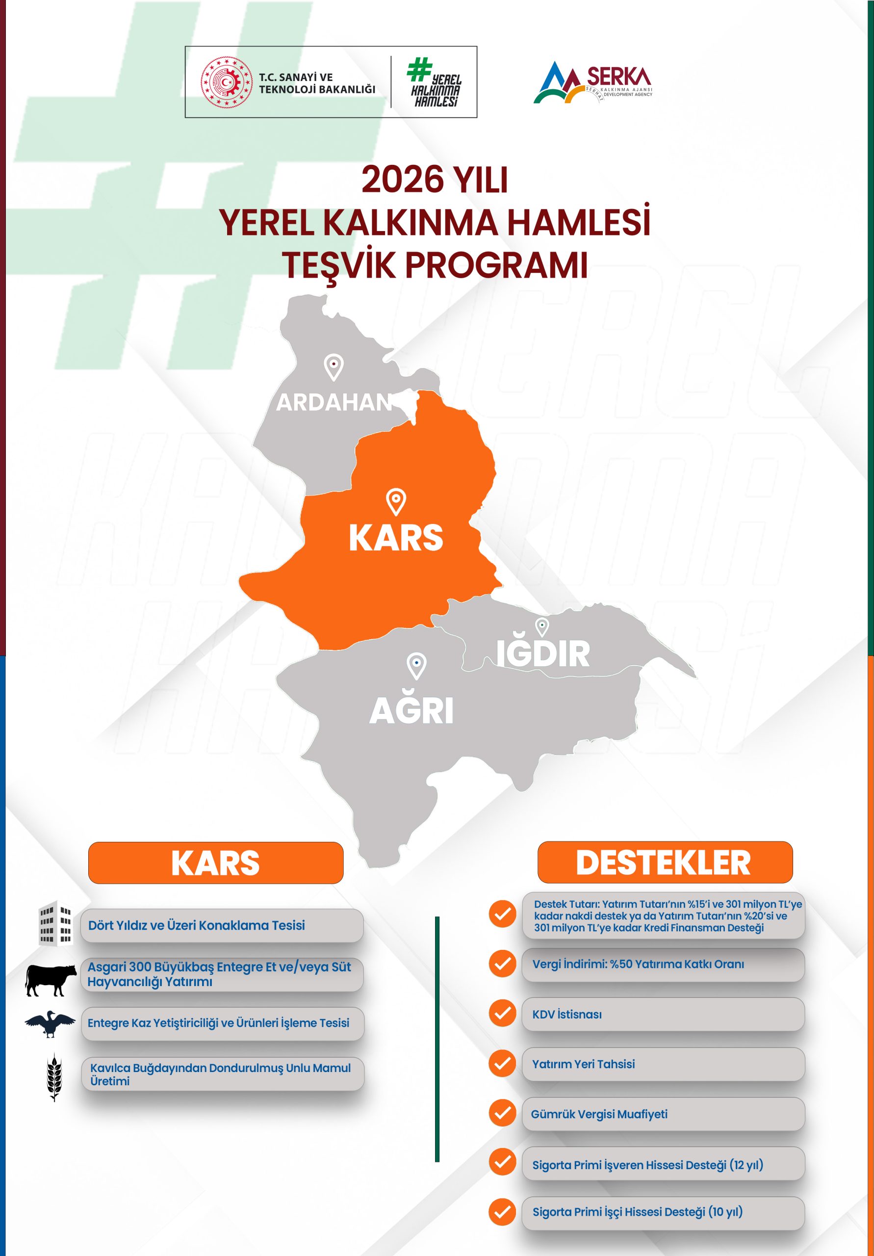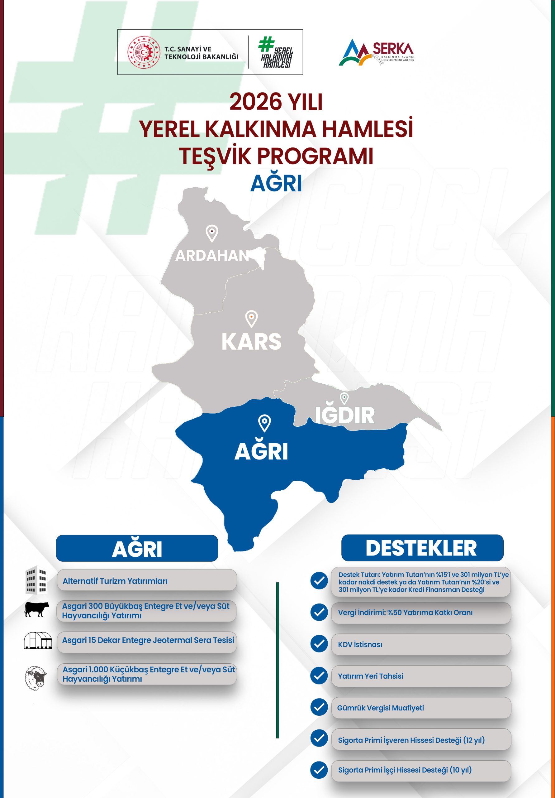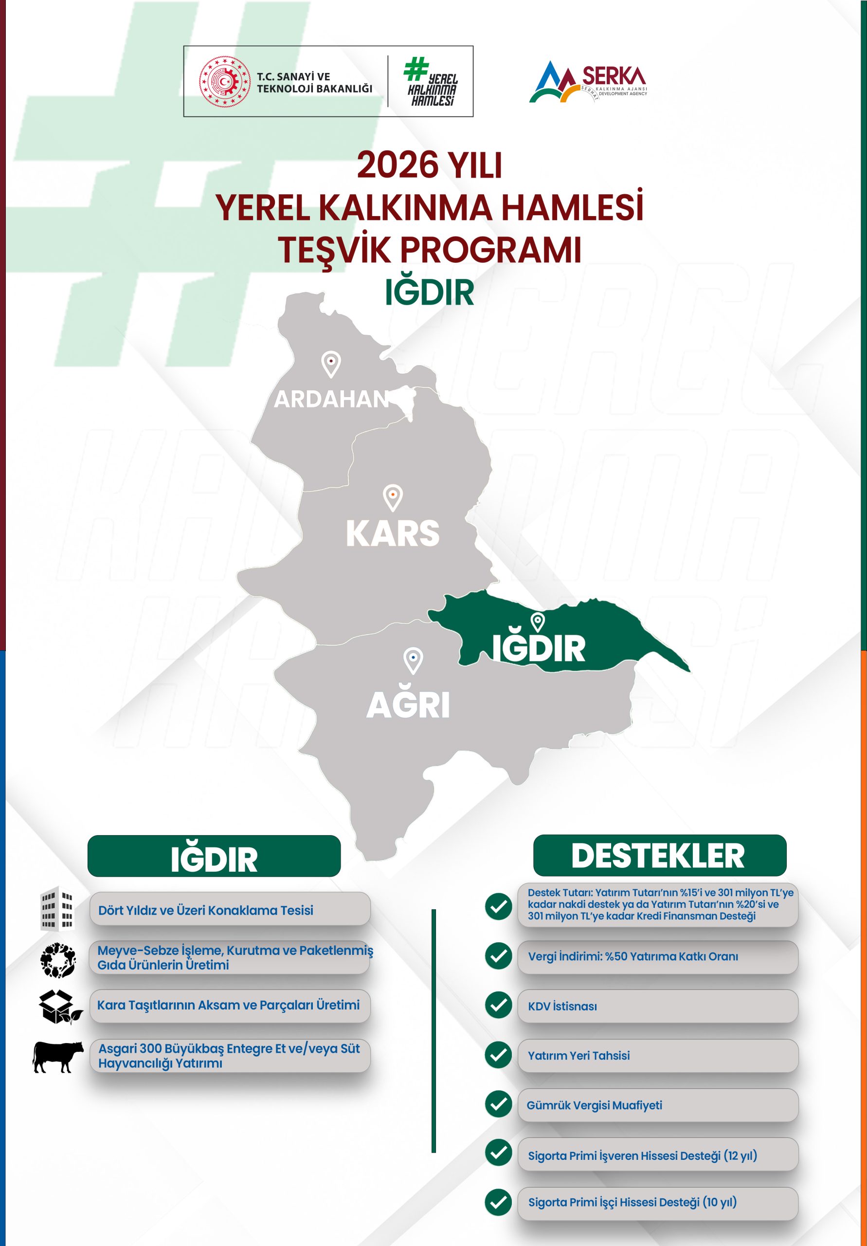 Sanayi ve Teknoloji Bakanlığı koordinasyonunda yürütülen Yerel Kalkınma Hamlesi Teşvik Programı kapsamında, TRA2 Bölgesi’nde (Ağrı, Ardahan, Iğdır, Kars) 2026 yılında desteklenecek yatırım konuları açıklandı. Program çerçevesinde her bir yatırım başlığı için aşağıdaki destek unsurları üzerinden destek sağlanacaktır. Bunlar;