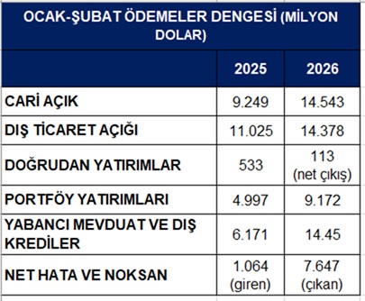 Merkez Bankası ödemeler dengesine göre, ocak-Şubat 2026, iki ayda cari açık 14 milyar 543 milyon dolar oldu. Geçen yılın aynı aylarında cari açık 9 milyar 249 milyon dolar olmuştu.