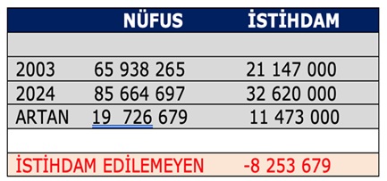 Aslında 2003 yılından 2024 yılına kadar, artan nüfusun tamamına iş yaratamadık. Eğitimdeki nüfus oranın değişmediğini varsayarsak, 2003 2024 yılına kadar geçen 21 yılda, artan 19 milyon 726 bin 679 kişi nüfusun yalnızca 11 milyon 473 bin kişisine istihdam yarattık, kalan 8 milyon 253 bin 679 kişiye istihdam yaratamadık. Bunlar da işsizlere katıldı.