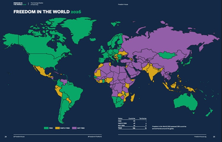 Freedom House (Dünya Özgürlükler evi) 2026 raporunda başlık ‘’Otokrasinin Büyüyen Gölgesi ‘’dir. Rapora göre Dünyada otokrasi tırmanıyor. 2025 yılında;