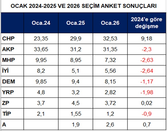 Vikipedi ,2024 ve 2025 Ocak ayı ortancaları ile 2026 yılı Ocak ayı ortalamasını alarak aşağıdaki tabloyu oluşturdum.